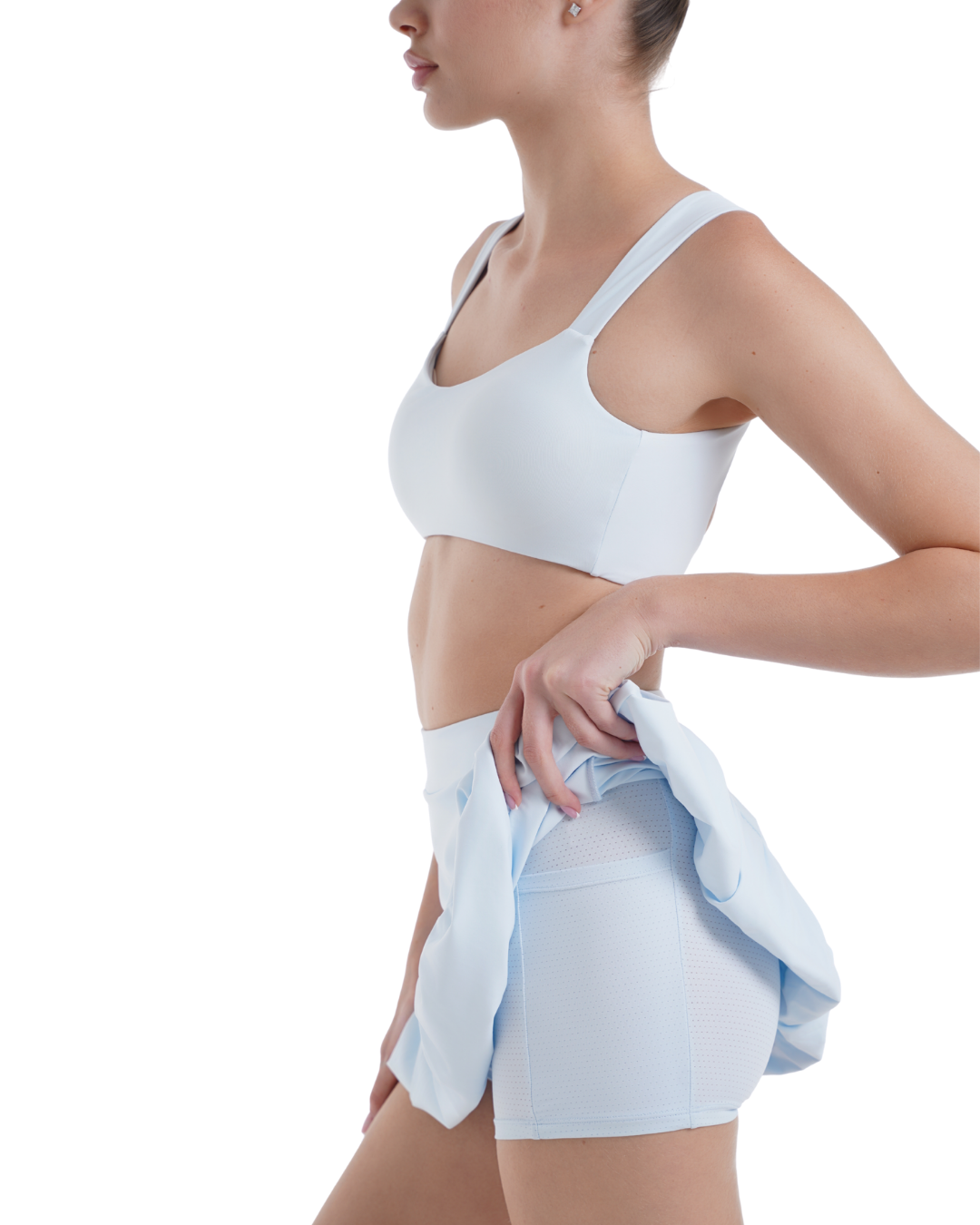 A feminine and functional two-piece set featuring a supportive sports bra with a chic open-back design and a flowy mini skirt with built-in shorts. Made from soft, stretchy, and breathable fabric, it’s designed for movement, comfort, and a flattering fit. The ruffled hem adds a playful and elegant touch — perfect for tennis, padel, and off-court days.